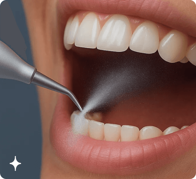 Airflow använder ett mjukt flöde av luft, vatten och ett fint pulver som löser upp plack, missfärgningar och bakterier – utan att skada tandytan. Metoden är skonsam och passar även dig med känsliga tänder, tandställning eller implantat. Resultatet blir en renare känsla och en naturligt ljusare ton på tänderna.